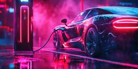 Neon Nights: A Sleek Electric Car Glows Under a Vibrant Canopy of Neon Lights, Plugged into a Charging Station, Ready for the City Electrifying After-Dark Adventures