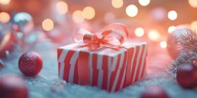 A Gift of Festive Cheer: A vibrant red gift box, adorned with a shimmering bow, sits nestled amidst a flurry of ribbons and sparkling lights, evoking the magic and anticipation of the holiday season