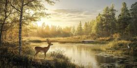 Serene Tranquility: A Deer Watches Over a Misty Dawn