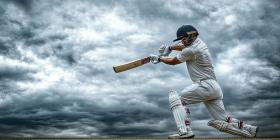 Cricketer Mid-Shot Against Dramatic Cloudy Sky on Cricket Pitch