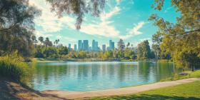An Urban Oasis: A Tranquil Lake Framed by Lush Greenery and the City Skyline
