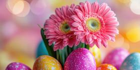 Springtime Symphony: A Colorful Easter Egg Arrangement with a Delicate Pink Gerbera Daisy