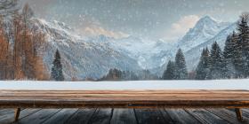 Winter Wonderland: A Snowy Mountain View from a Wooden Deck