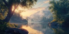 A Serene Twilight: Water Lilies Bloom in a Misty River at Sunset