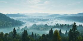 A Tapestry of Twilight: A Mountainous Landscape Bathed in the Golden Light of Sunset, Mist Shrouding the Valleys Below
