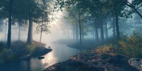 A Misty Morning: A Serene Stream Winds Through a Fog-Shrouded Forest