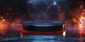 A Portal to the Sublime: A Circular Platform Framed by Majestic Peaks and a Dramatic Sunset