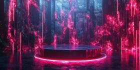 A Portal to the Sublime: A Circular Platform Framed by Majestic Peaks and a Dramatic Sunset