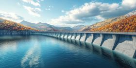 Concrete Dam with Water Flowing Through Gates, Surrounded by Autumnal Foliage for Industrial, Engineering, and Natural Resources Concepts