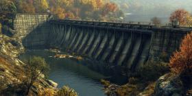 Concrete Dam with Water Flowing Through Gates, Surrounded by Autumnal Foliage for Industrial, Engineering, and Natural Resources Concepts
