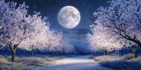 Enchanted Moonlight Scene with a Full Moon Shining Over a Field of Blossoming Trees and a Path Winding Through a Sea of Dandelions