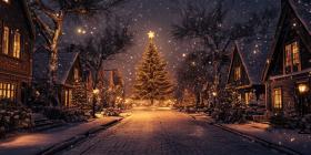 Magical Christmas Eve Scene with a Snow-Covered Street, Cozy Houses, and a Majestic Christmas Tree Illuminated with Warm Lights
