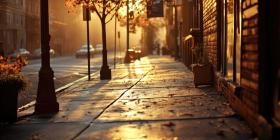 Serene City Street at Sunrise with Warm Sunlight Filtering Through Trees, Casting Long Shadows on the Sidewalk