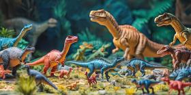 Prehistoric Playtime: A Diverse Collection of Colorful Dinosaur Toys Roaming a Miniature Jurassic Landscape