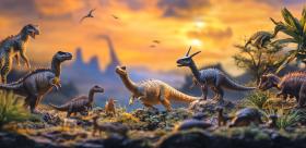 Prehistoric Playtime: A Diverse Collection of Colorful Dinosaur Toys Roaming a Miniature Jurassic Landscape