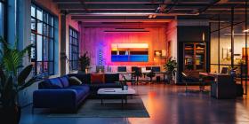 Modern Gaming Setup with Dual Monitors, Neon Lights, and a Brick Wall in a Loft-Style Room for Tech, Gaming, and Interior Design Concepts