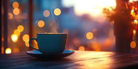 Cozy Morning Scene with a Steaming Cup of Coffee on a Wooden Table by a Window with Sunlight Streaming Through