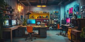 Modern Gaming Setup with Dual Monitors, Neon Lights, and a Brick Wall in a Loft-Style Room for Tech, Gaming, and Interior Design Concepts