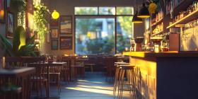 Warm and Inviting Cafe Interior with Wooden Tables and Chairs, Plants, and Sunlight Streaming Through Large Windows
