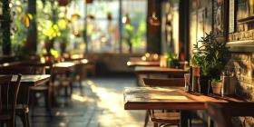 Warm and Inviting Cafe Interior with Wooden Tables and Chairs, Plants, and Sunlight Streaming Through Large Windows