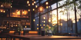 Warm and Inviting Cafe Interior with Wooden Tables and Chairs, Plants, and Sunlight Streaming Through Large Windows
