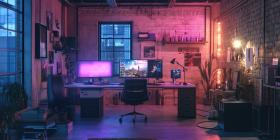 Modern Gaming Setup with Dual Monitors, Neon Lights, and a Brick Wall in a Loft-Style Room for Tech, Gaming, and Interior Design Concepts
