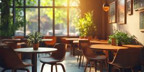 Warm and Inviting Cafe Interior with Wooden Tables and Chairs, Plants, and Sunlight Streaming Through Large Windows