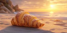 Golden Croissant Bathed in Warm Light Against a Colorful Draped Background for Food Photography, Bakery, and Still Life Concepts