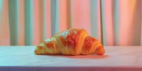 Golden Croissant Bathed in Warm Light Against a Colorful Draped Background for Food Photography, Bakery, and Still Life Concepts
