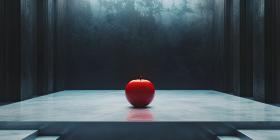 Minimalist Still Life with a Single Red Apple Resting on a Concrete Floor Bathed in Sunlight