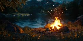 Tranquil Campsite at Dusk with a Cozy Tent Illuminated by a Warm Fire Beside a River, Under a Night Sky