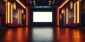 Empty Movie Theater with Red Neon Lights, a Blank Screen, and Rows of Empty Seats Evoking a Sense of Nostalgia and Anticipation