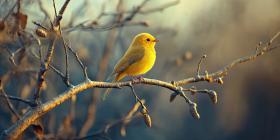 Vibrant Yellow Bird Perched on a Branch with a Butterfly Flying Nearby in a Sunlit Garden for Nature, Wildlife, and Springtime Concepts