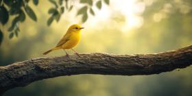 Vibrant Yellow Bird Perched on a Branch with a Butterfly Flying Nearby in a Sunlit Garden for Nature, Wildlife, and Springtime Concepts