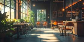 Warm and Inviting Cafe Interior with Wooden Tables and Chairs, Plants, and Sunlight Streaming Through Large Windows
