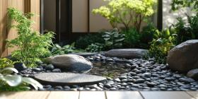 Vibrant Garden Scene with Colorful Flowers, Lush Greenery, and Smooth River Rocks Bathed in Sunlight