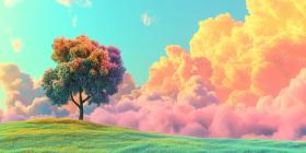Surreal Landscape with a Solitary Tree Standing Tall Against a Dreamy Sky with Vibrant Pink and Orange Clouds
