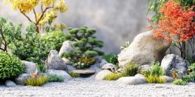 Vibrant Garden Scene with Colorful Flowers, Lush Greenery, and Smooth River Rocks Bathed in Sunlight