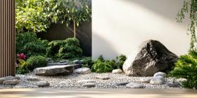 Vibrant Garden Scene with Colorful Flowers, Lush Greenery, and Smooth River Rocks Bathed in Sunlight