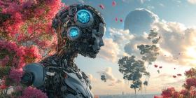 Harmony of Future and Nature: Humanoid Robot Amidst Vibrant Pink Flowers in Surreal Cityscape