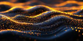 Abstract Digital Landscape with Flowing Waves of Glowing Particles and a Dark Background for Technology, Sci-Fi, and Modern Designs