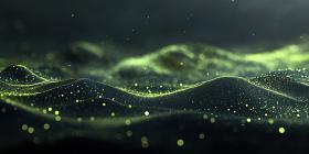 Abstract Digital Landscape with Wavy Lines of Glowing Green Dots on a Dark Background for Technology, Sci-Fi, and Modern Designs