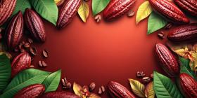 Ripe Cocoa Pods Hanging from a Cacao Tree with Lush Green Leaves for Chocolate, Agriculture, and Food Production Concepts