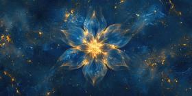 Cosmic Bloom: A Fractal Flower with Blue Petals and a Glowing Golden Core Against a Starry Night Sky