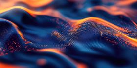 Abstract Digital Landscape with Flowing Waves of Glowing Orange and Blue Particles for Technology, Sci-Fi, and Modern Designs