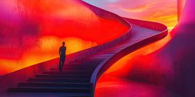 Journey to the Unknown: Person Ascending Colorful Stairs in a Surreal Dreamscape