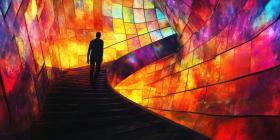 Journey to the Unknown: Person Ascending Colorful Stairs in a Surreal Dreamscape