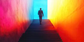 Journey to the Unknown: Person Ascending Colorful Stairs in a Surreal Dreamscape