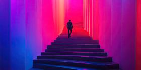 Journey to the Unknown: Person Ascending Colorful Stairs in a Surreal Dreamscape