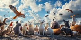 Wildlife Panorama: Majestic Mountain Landscape with Diverse Animals. Scenic photo featuring birds, cats, and a lion. Perfect for nature, wildlife, and travel projects.